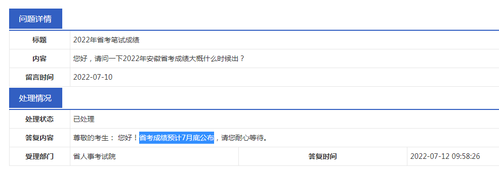 2022安徽省考筆試于7月9日-10日結束,相信很多小伙伴都比較關心公布成績的消息,以下是安徽博學教育小編在安徽省人社廳的互動交流欄目看到的官方信息回復,希望對有事幫助!