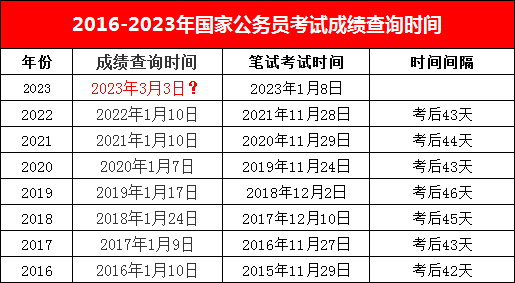 從上圖可以看出,往年國考筆試與成績發(fā)布間隔時間比較固定,在40多天,但截至今天,也就是3月3日,距離國考筆試已經(jīng)過了52天了,小編預測接下來的每天都有可能會出啊,大家要多多關注報名網(wǎng)站,及時查詢成績。