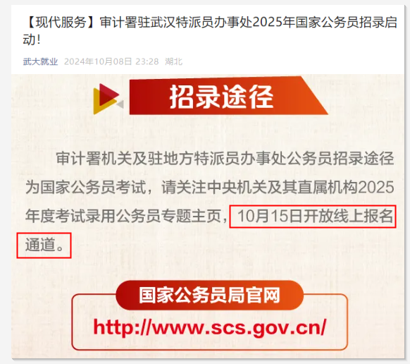 重要通知!2025年國(guó)考報(bào)名時(shí)間定啦!昨晚,武大就業(yè)發(fā)布《審計(jì)署駐武漢特派員辦事處2025年國(guó)家公務(wù)員招錄啟動(dòng)!》,其中提到:2025國(guó)考將于10月15日開(kāi)放報(bào)名通道。