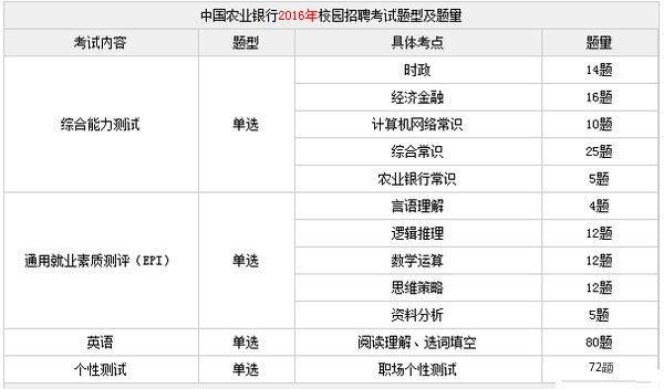 2018中國農(nóng)業(yè)銀行校園招聘考試內(nèi)容根據(jù)歷年考情來看,中國農(nóng)業(yè)銀行校招考試內(nèi)容基本變化不大,包括:通用素質(zhì)能力測試(EPI)、綜合能力測試、英語、性格測試。主要是在具體考試項目、題量上有相應(yīng)變化。(以下往年考試科目及題量僅供參考,具體以2018農(nóng)行校園招聘考試為準。)