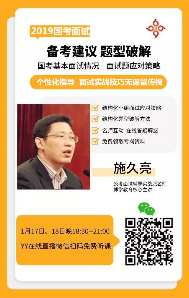 推薦閱讀:2019年國(guó)家公務(wù)員考試面試備考專(zhuān)題:成績(jī)查詢(xún)|面試時(shí)間|面試名單|面試公告|資格復(fù)審匯總