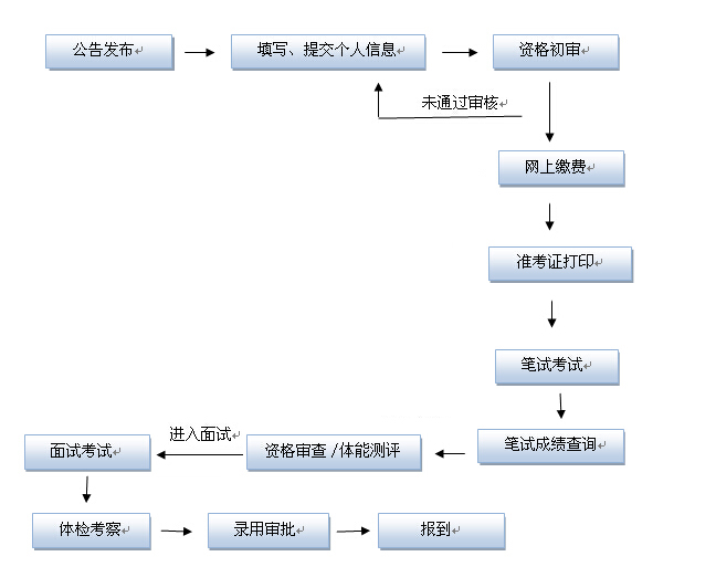 考試錄用工作按照制定錄用計劃、發(fā)布招考公告、報名與資格審查、筆試、資格復審、體能測評(人民警察職位)、面試、體檢與考察、公示、審批錄用等步驟進行,由省公務員主管部門統(tǒng)一組織,有關工作由各市、省直管縣公務員主管部門和省直招錄機關具體組織實施。